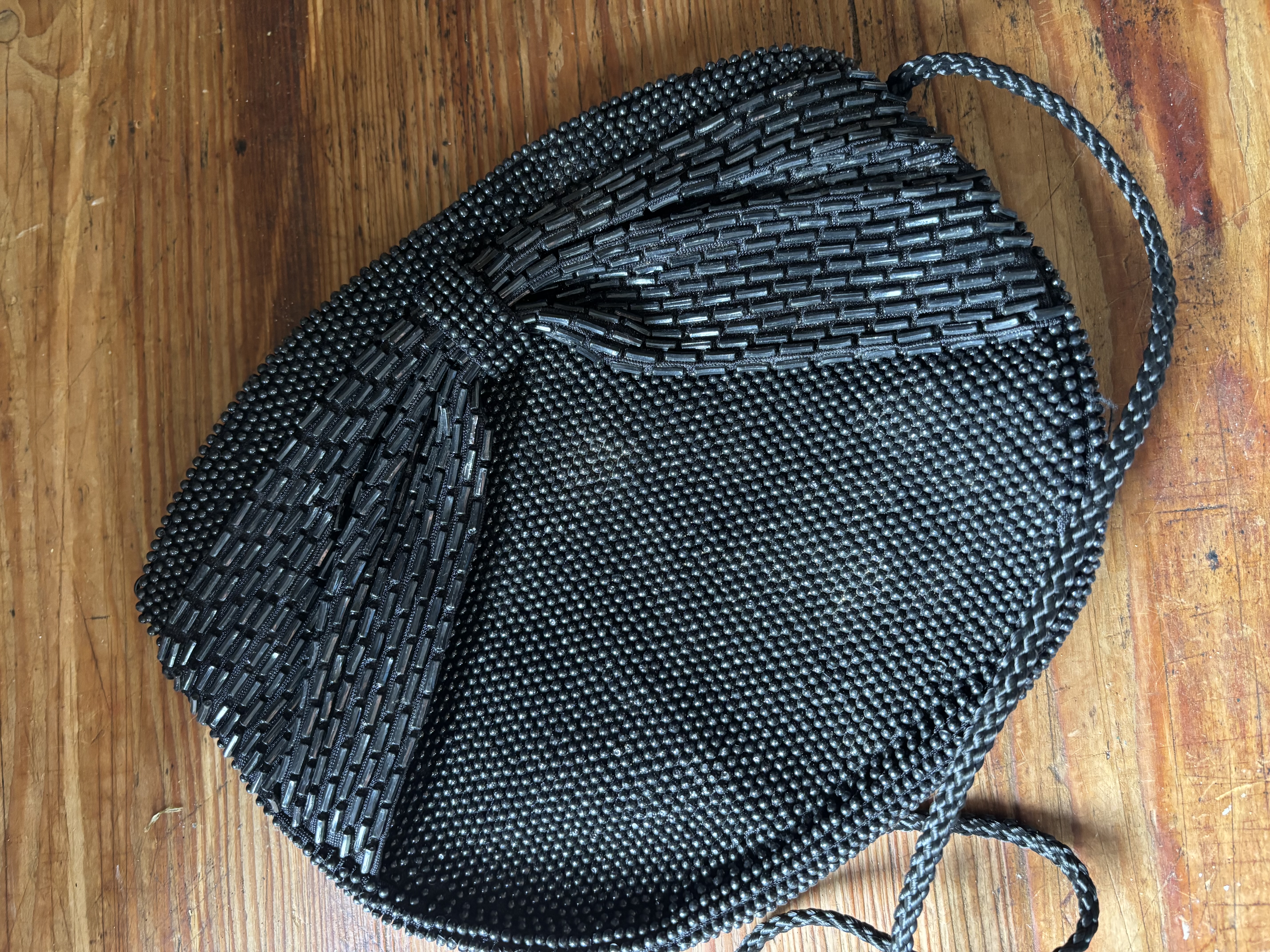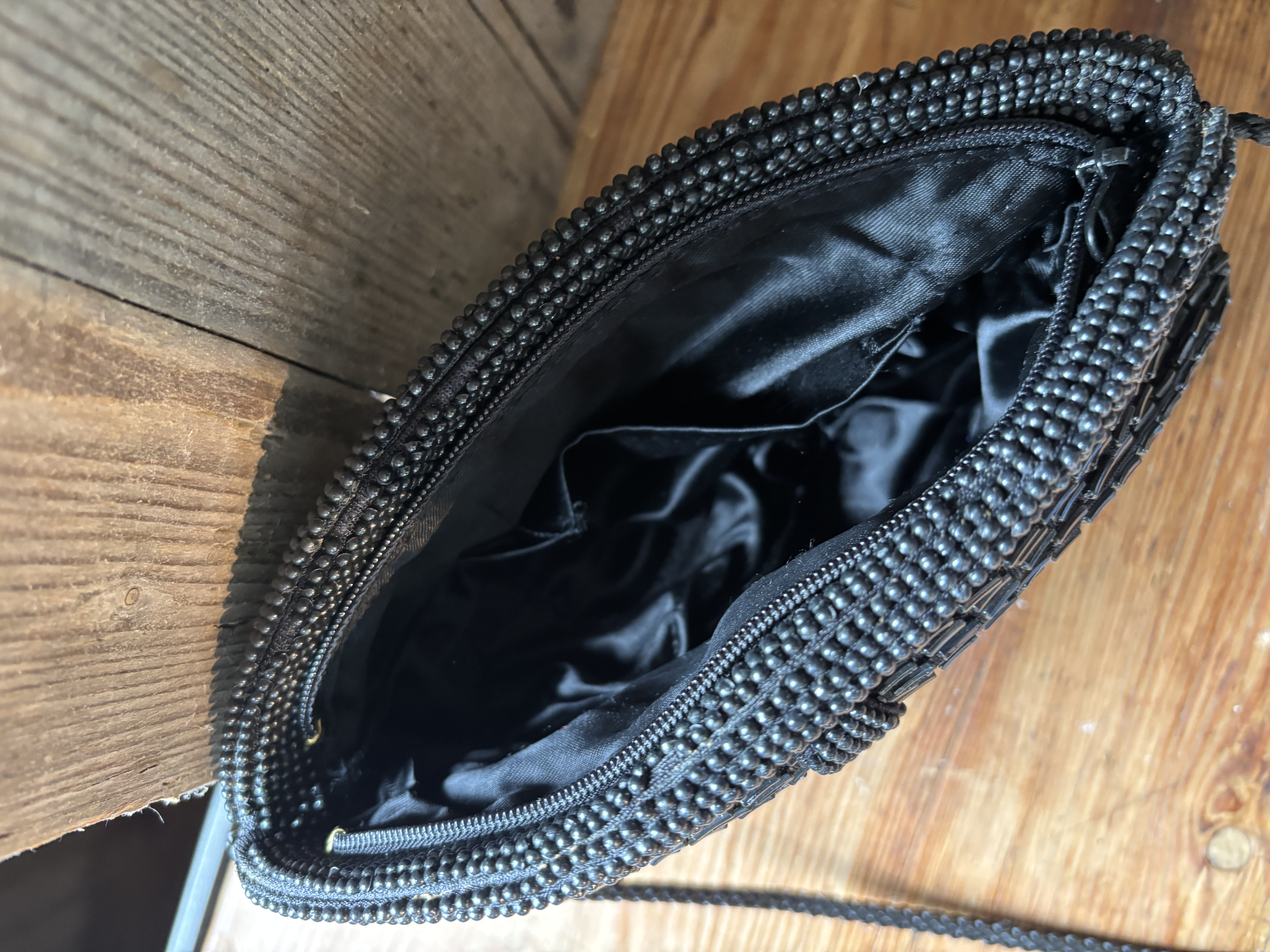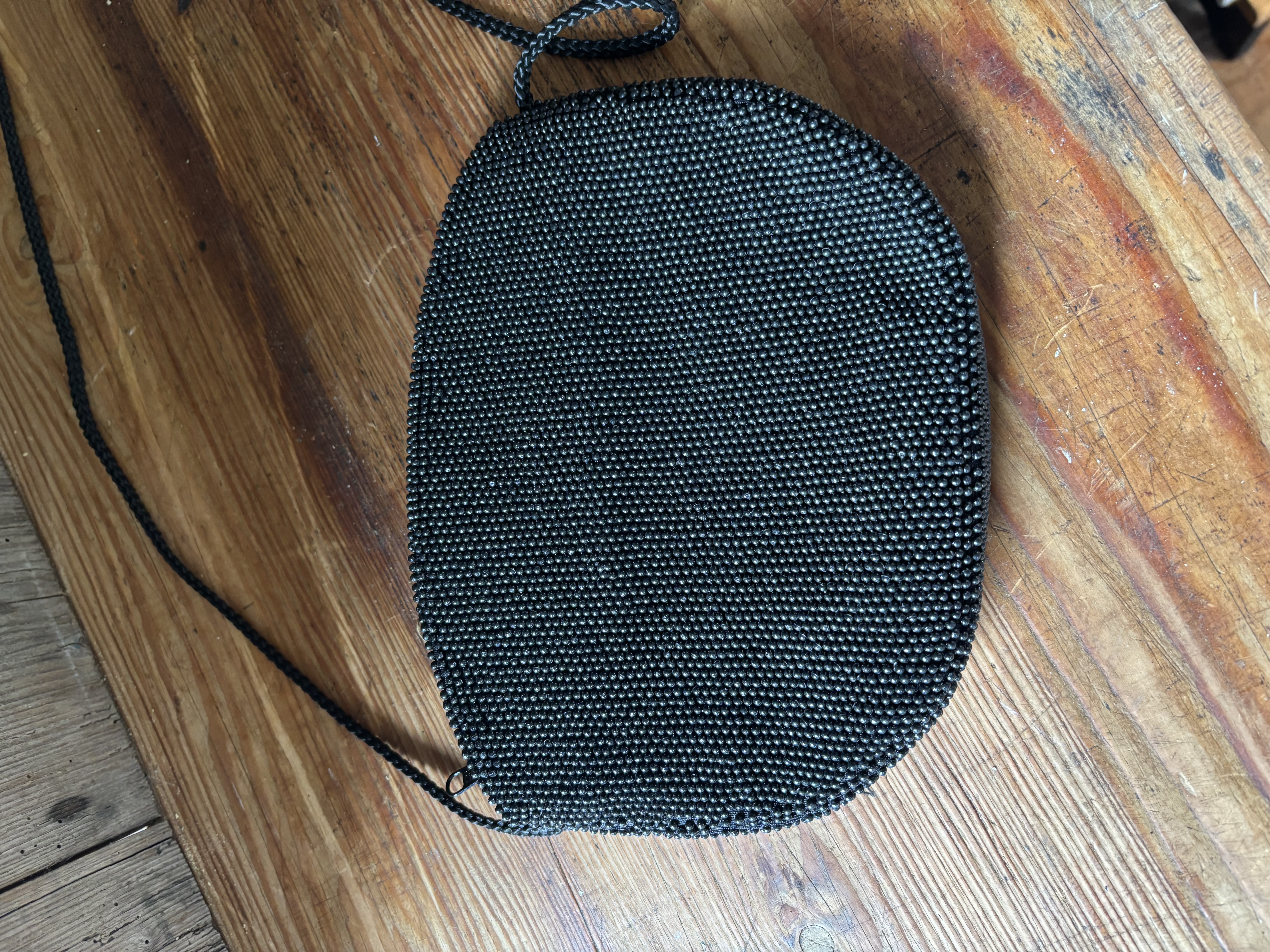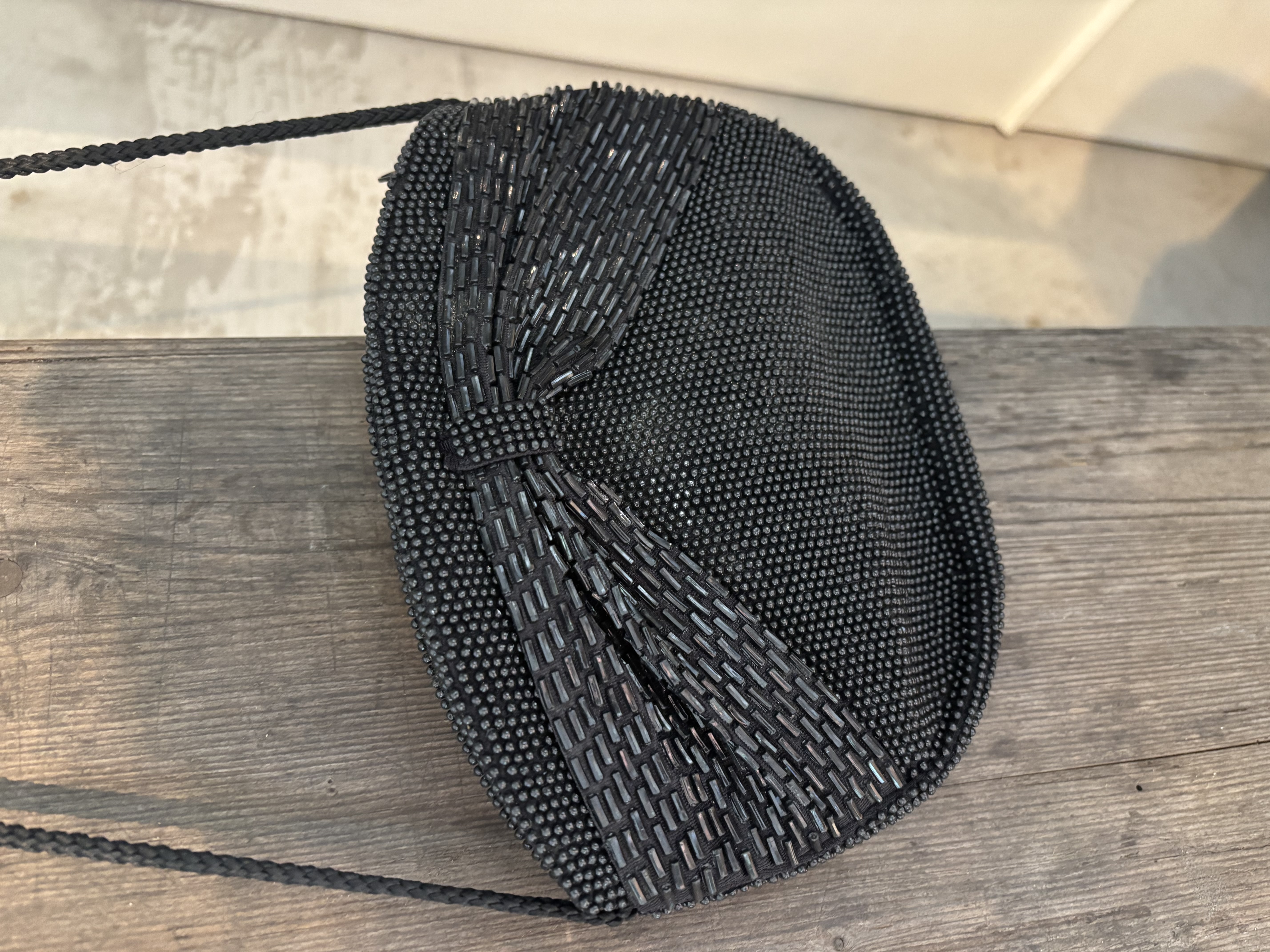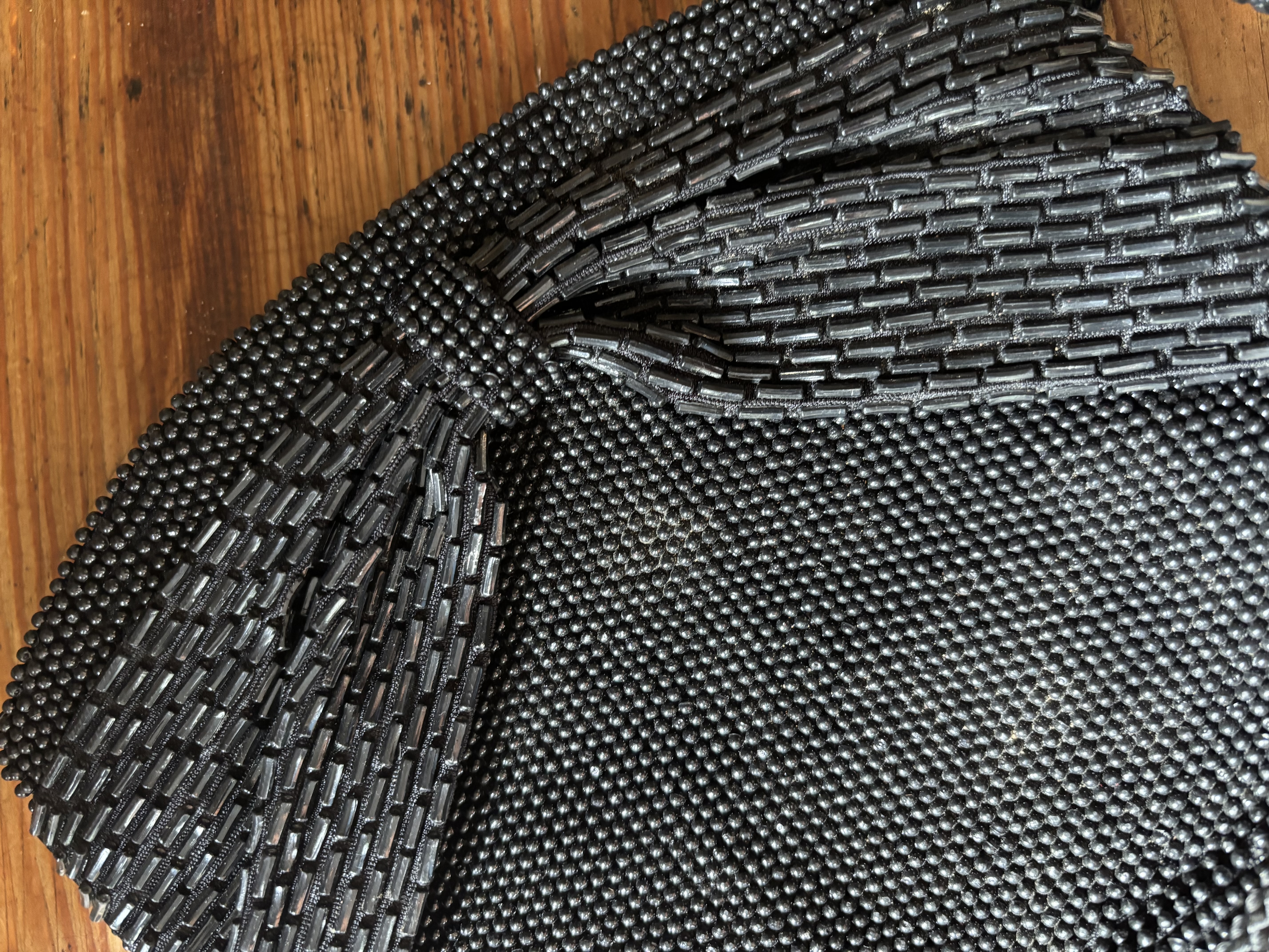 Een tasje helemaal van zwarte kraaltjes met een zwarte kralen strik