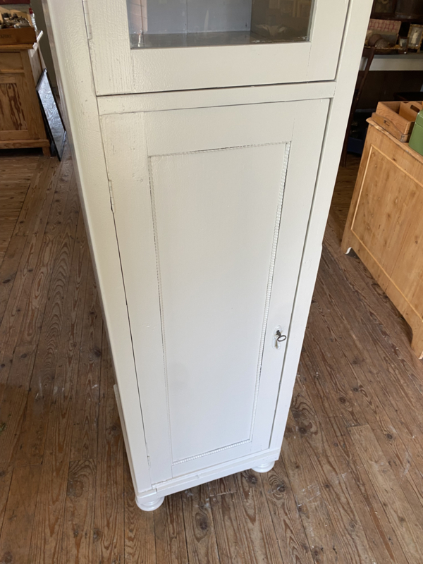 Eendeurs vitrinekast met onderkast en deuren linksom open.