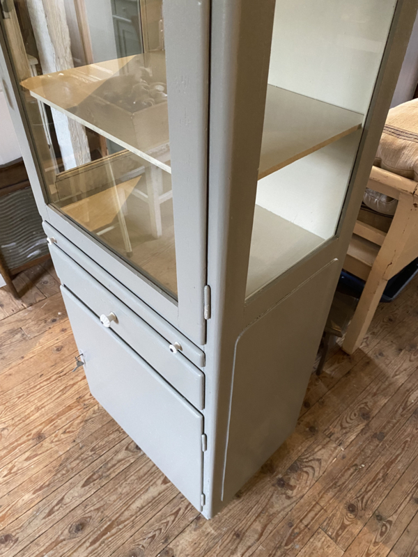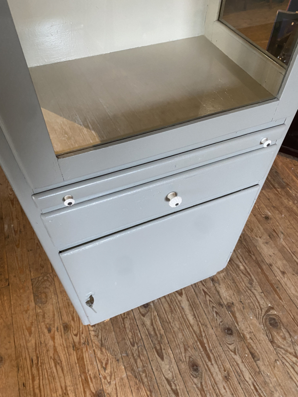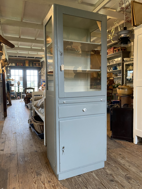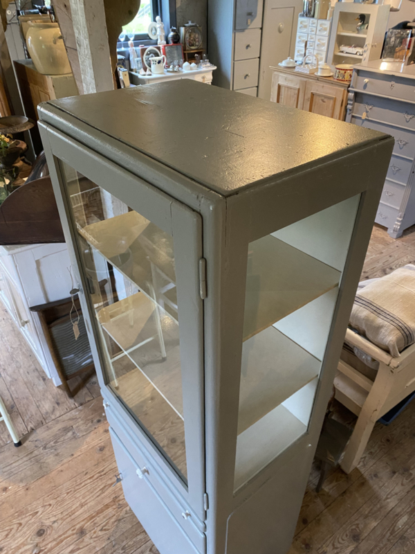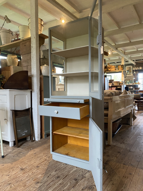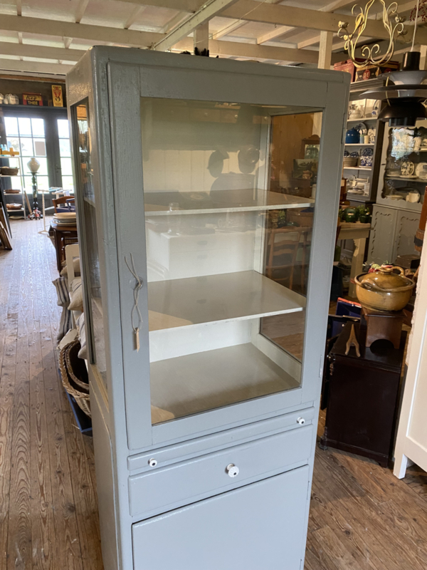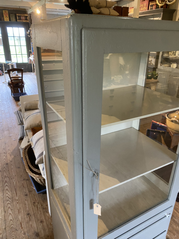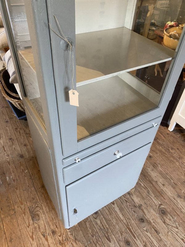 ( Verkocht ) Prachtige houten grijze vitrinekast.