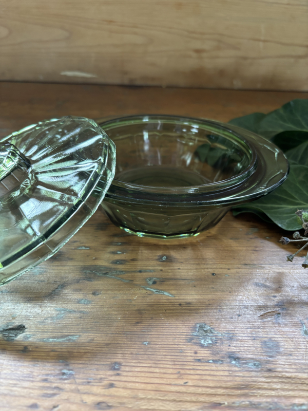 Een groen prachtig persglas bakje met deksel